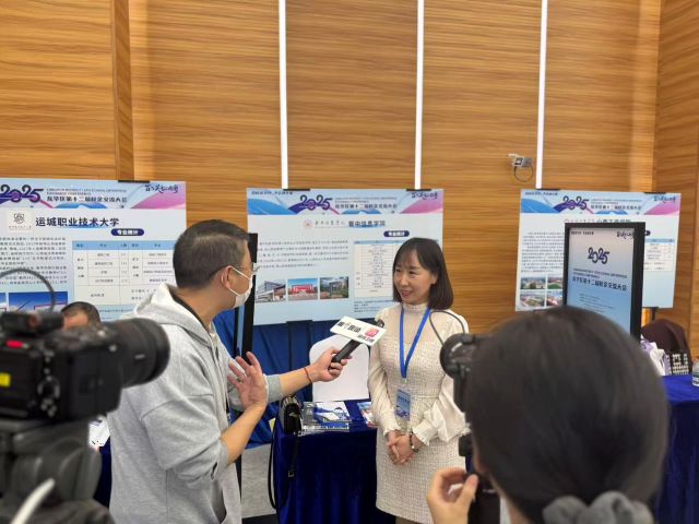 大会现场,李风娇院长作为院校代表接受当地媒体专访。她围绕我校“四位一体双院制”人才培养模式,介绍了我校独特的办学模式,通过各类活动培养具有信息产业专业技术背景的高情商经营管理人才,同时介绍了我院的专业特色,让参会企业全面了解学校的学生特点,诚挚欢迎企业来我校招聘。