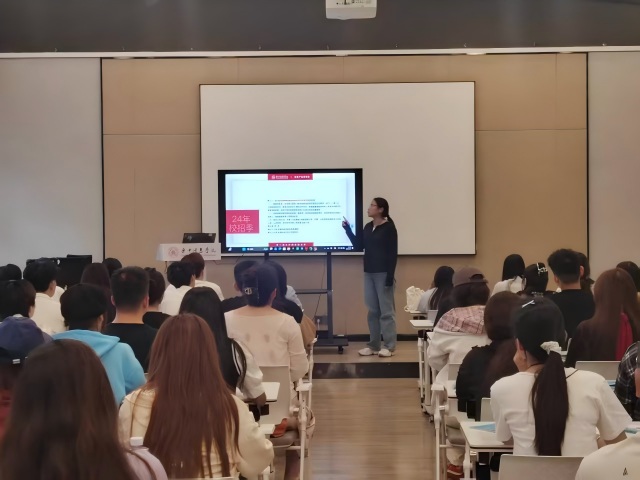 会上,张潇尹老师以学校就业指导中心最新数据开场:“2024年校招季中,平均每个岗位收到简历约80份,但进入面试环节的仅占15%,最终录用率不足5%。”她指出,在竞争激烈的就业市场中,掌握求职技巧是突破“简历石沉大海”“面试失利”困境的关键。为直观展现求职流程,张潇尹老师通过时间轴梳理了“简历投递—笔试—面试—签约”全链条,强调每个环节的重要性。
