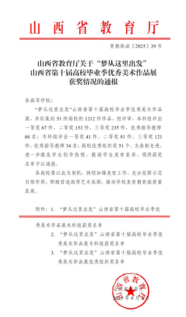 在山西省教育厅主办的“梦从这里出发”山西省第十届高校毕业季优秀美术作品展中,共征集到51所高校的1212件作品。我校艺术传媒学院师生凭借出色的创作实力斩获多项荣誉,尽显丰硕成果。2件作品斩获一等奖,3件作品荣获二等奖,15件作品摘得三等奖。此外,晋中信息学院还成功荣获本次展览的“优秀组织奖”,这既是对学校组织工作的高度认可,也是对艺术传媒学院美育工作成效的有力彰显。
