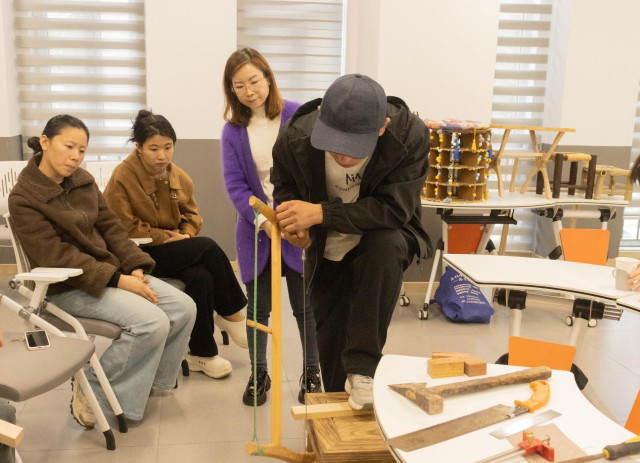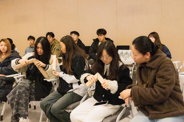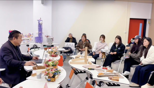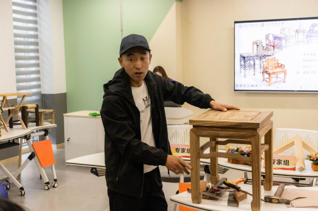 课堂在“溯本求源·晋作之美与榫卯之智”中开启。非遗传承人成飞老师首先展示了晋作家具的经典之作,其流畅的线条与严谨的结构引人入胜。他通过拆解的榫卯模型,生动揭示了不用一钉一铆却能力承千钧的结构奥秘,诠释了“道在器中”的古老哲学。陈立潮教授则从鲁班锁、鲁班椅等经典实例切入,深度剖析其中蕴含的工匠精神与造物智慧,使学生们的认知从审美表象深入至文化内核。