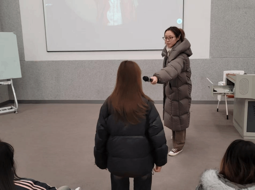 授课中,两位教师围绕声音的叙事功能互动研讨,形成良好的教学互补。闫老师从文学改编逻辑出发,提出“声音如何填补小说到电影的叙事空白”问题;田老师结合实操经验,从音效设计、音乐渲染、声音桥应用等方面解答,引导学生打破“画面为主、声音为辅”的认知,理解声音在推动情节、传递情感、构建视听叙事中的核心价值。