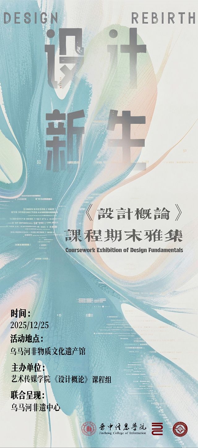 12月25日,晋中信息学院艺术传媒学院《设计概论》课程结课汇报交流活动于乌马河非遗博物馆圆满举办。艺术传媒学院院长盛卓立、视觉传达教研室主任孔霞、《设计概论》课程负责人闫晓英等教师,以及25级学生代表共同参与本次活动。活动以“设计新生”为主题,依托乌马河非物质文化遗产馆现代转译实训项目,将AI技术应用、非遗文化传承与课程思政教育深度融入教学实践,打造出理论与实践双向赋能的教学成果展示舞台。