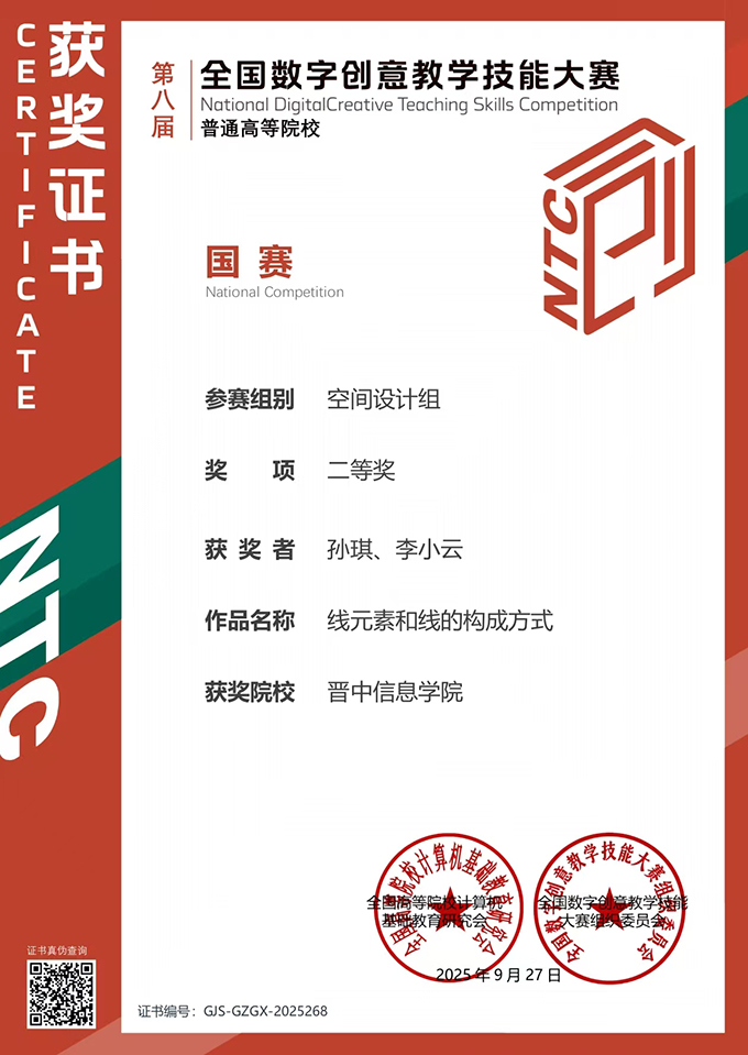 9月28日,由全国高等院校计算机基础教育研究会、全国数字创意教学技能大赛组织委员会联合主办,全国高等院校计算机基础教育研究会数字创意专业委员会与长沙理工大学共同承办的第届全国数字创意教学技能大赛国赛终评会及颁奖典礼圆满落幕。我校艺术传媒学院孙琪副院长、李小云老师,凭借紧扣数智化教学趋势的创新研究与扎实教学功底,在空间设计组激烈角逐中斩获国家级二等奖,为学院教学成果再添亮眼注脚。