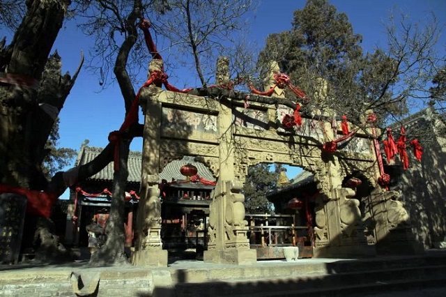 寺内有一座高大威严的石碑坊,从外观上来看它保存的十分良好。它是四柱三楼式的,上面的青石质匾额一共有四块,其中一块还留有题记“道光庚寅”(1830)。就这座石碑坊还流传着“一牌两匾三门四柱五狮”的说法。在寺的西侧还有一株汉槐,它已经1800岁了,是太谷现存最古老的槐树。在过去的漫长岁月中,都是这株汉槐陪伴着孤独的寺庙一起长大,一起度过了一个又一个的春夏秋冬。