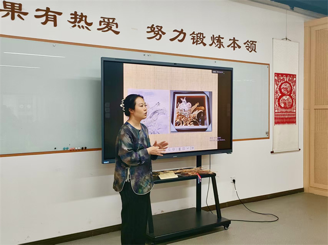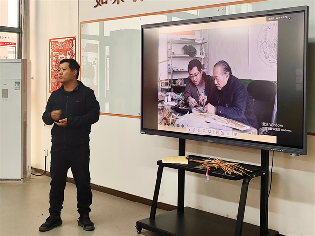 活动现场,师生互动氛围热烈而鲜活。王峰老师首先展示了多件珍藏的麦秆画作品,从民国时期的民俗题材到现代创新设计,结合自身创作经历拆解“选秆、剪刻、烫染”等核心技法,“麦秆的粗细、烫色的温度都会影响最终效果,大家要学会观察麦秆本身的纹理”,他一边讲解一边拿起工具示范,让抽象的技艺变得直观易懂。
