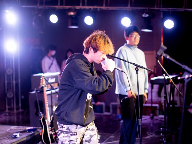 随后,多位“新”生音乐人轮番登台,将“勇敢做自己”的态度演绎得淋漓尽致。代坤鹏带来《supra》,前卫编曲中满是不羁的自信,每一段旋律都在宣告着独特的自我;2025级新生张文俊一开口就戳中了泪点,唱到“你说青春是场大雨”时,他声音发颤,慢慢的,几百个声音叠在一起,像潮水漫过操场;“男明星”李林翰更绝,前一秒还用低哑声线唱《突然想起你》,下一秒全场又疯了似的蹦跳,有人把书包举过头顶挥舞,有人喊“艺术C位出道,你超牛!”