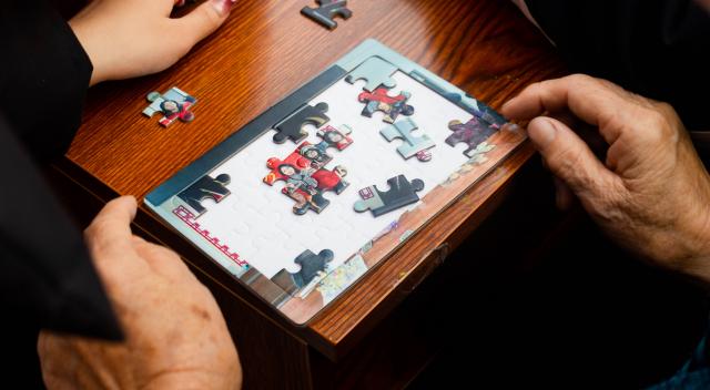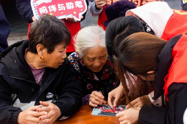 拼图环节是整场活动的温情核心。志愿者提前准备好印有太平庄村风貌——生日会、巷尾石阶、和志愿者们的合照等熟悉场景的拼图,分发给到场老人后,两人一组俯身相伴,或手把手指导拼合技巧,或陪着老人一起寻找对应碎片。当拼图上的村落画面逐渐完整,老人们的话匣子自然打开:“你看以前我们老在这儿聊天”等,细碎的往事、共同的记忆顺着拼图碎片的拼接缓缓流淌,原本日常往来不多的邻里,因“共同的生活印记”慢慢熟络;志愿者静静倾听、偶尔搭话,在陪伴中走进老人们的岁月,代际与邻里的距离,就在这一拼一聊间悄然拉近。