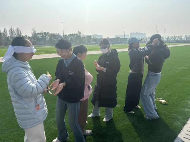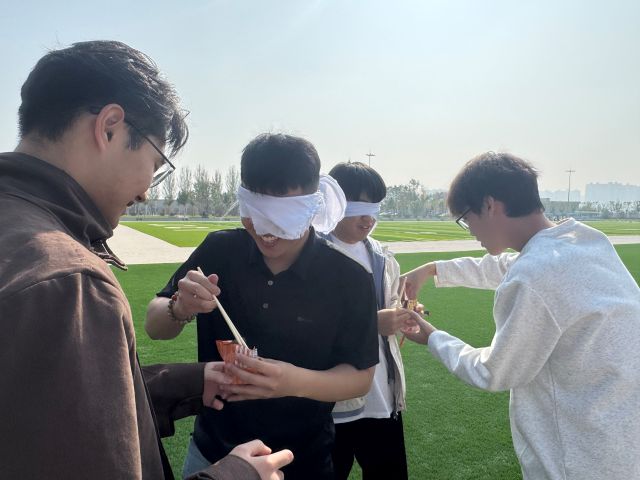 “蒙眼投喂” 环节堪称信任与默契的考验。两人一组,一人蒙眼后,在同伴的指挥下将食物投喂到对方口中。部分小组还遭遇了 “绕障碍物” 的小挑战,但大家耐心沟通、互相配合,成功完成投喂任务。当食物准确送入对方口中时,彼此相视一笑,陌生感瞬间消融。“谁是贪吃鬼” 则充满趣味推理色彩,蒙眼的 “贪吃鬼” 悄悄吃下一种蒙眼放置的零食,其余同学摘下眼罩后凭借细节猜测 “贪吃鬼” 身份。大家各抒己见、踊跃推理,现场不时爆发阵阵笑声,互动频率与参与感大幅提升。
