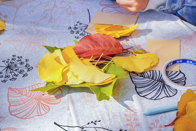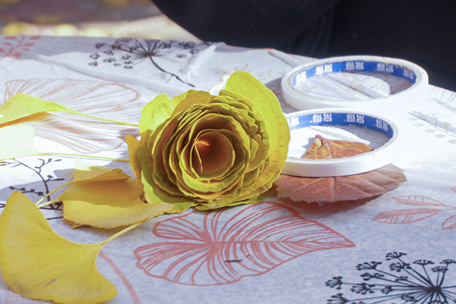 那是秋风与落叶的私语,也是创作者心声的传递。银杏束光区中,金黄的叶片被精心整理、层层叠叠,再用丝带缠绕捆扎,让花束既有秋日的厚重,又不失灵动。捧在手心的不仅是一束叶花,更是一整个季节的明媚与温柔。信封装秋区则满是静谧与浪漫,同学们将捡拾的落叶压平定型,用胶水细细粘贴在空白信封上,叶片的纹路与信封的质感相互映衬,别具韵味。