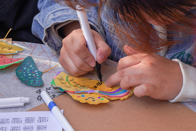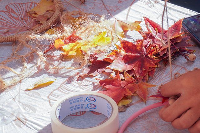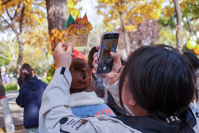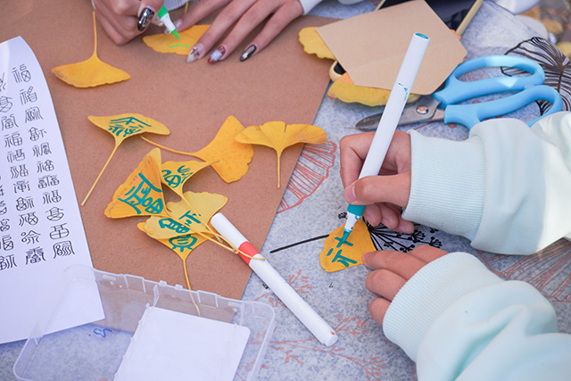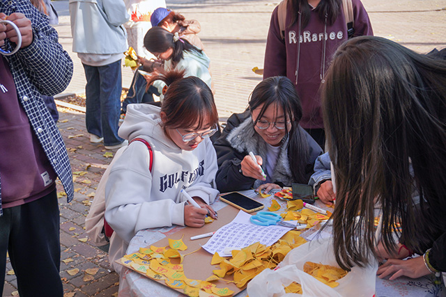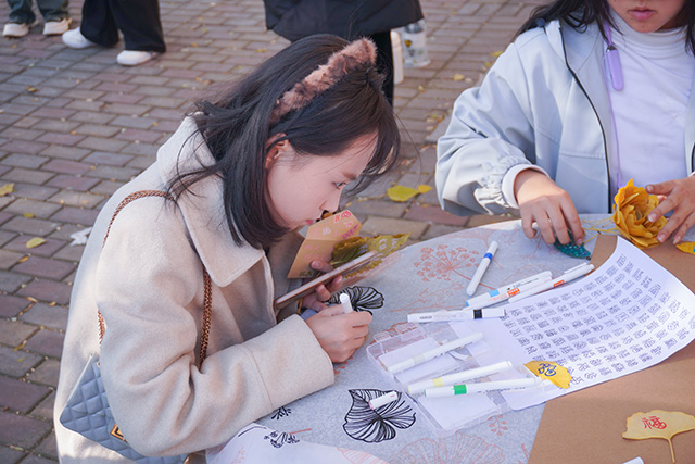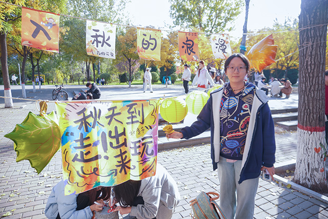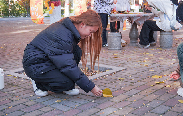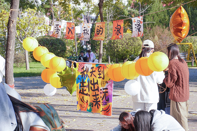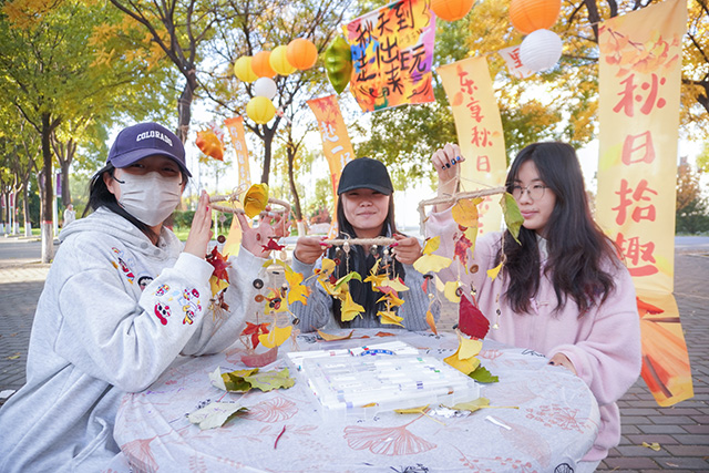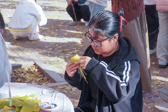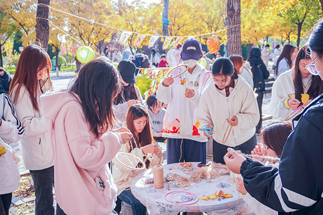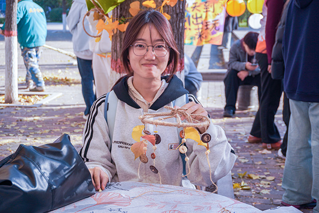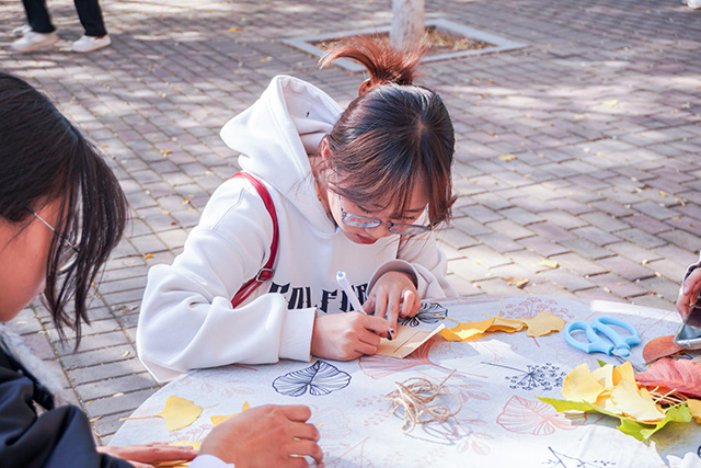 秋日常是短暂易逝的,枝头的绚烂往往转瞬即逝,而这场活动恰好为同学们提供了定格秋光的契机。活动当日,阳光透过枝叶的缝隙洒下斑驳光影,小树林里早已备好棉线、串珠、丝带、空白信封等各类材料,工作人员身着统一服饰,在各个手作区耐心等候。