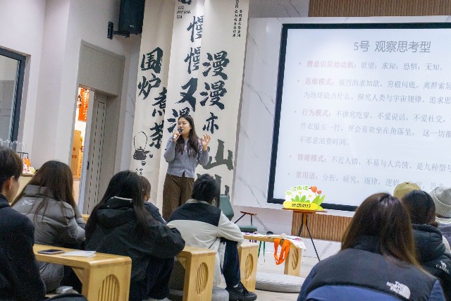 冯老师一开场便抛出引人深思的观点:“我们大多数人其实都处在一种‘性格自动驾驶’状态,横冲直撞,直到撞得伤痕累累。”她巧妙地将完满人格理论比作一本我们一直缺失的《人类意识使用说明书》,而学习它的目的,正是让我们从被动承受性格本能,转变为主动驾驭人生的“魔法师”。冯老师以“苹果砸头”为例,描绘了不同人格的生动反应:1号完美型会立刻追问是谁种的树不合规范;5号思考型则会像牛顿般陷入“苹果为何不往上飞”的沉思;而7号活跃型可能兴奋地摇树,期待下一个苹果落下……这些鲜活例子让同学们在笑声中迅速领悟人格差异的奥妙,现场氛围轻松而热烈。