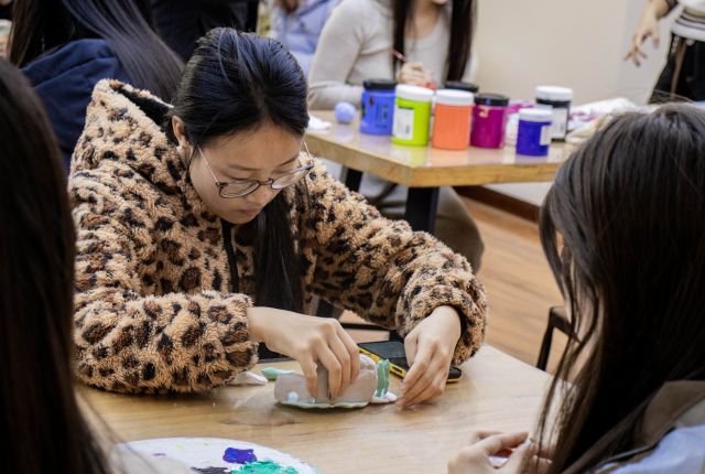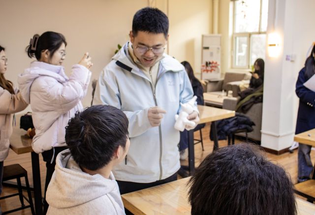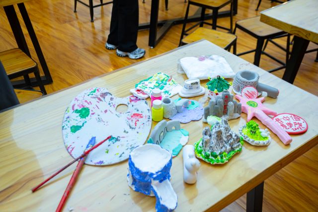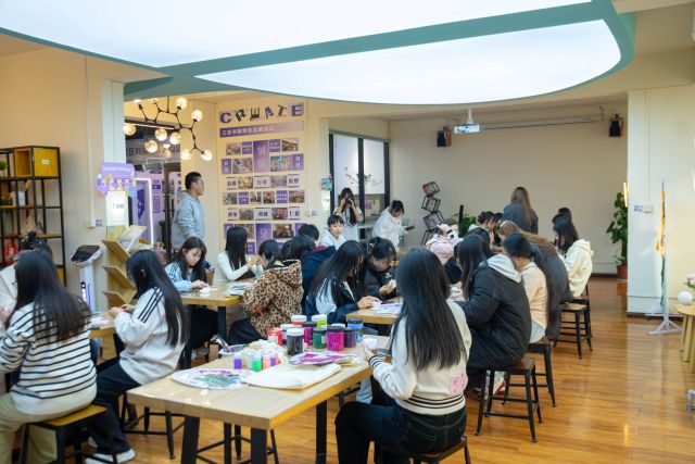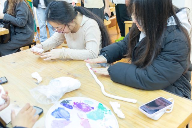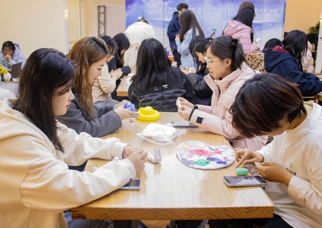 揉、捏、塑、刻的细微声响里,朴素的黏土逐渐显露出校园的模样:有人复刻了教学楼的圆弧窗户,用工具轻压出墙面肌理;有人以绿色黏土堆叠出林荫道的树影,搭配迷你草地底座;带有校名字样的黏土标识被精心刻上细节。现场作品中,不仅有建筑模型,更有融合了创意巧思的“校园符号”——比如粉色海星造型的装饰件,巧妙呼应了校园景观中的河流元素设计。