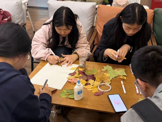 随后的拼贴环节将活动推向高潮。小艺学子运用马克笔在漂流瓶和树叶上进行创意涂鸦,随后将装饰好的树叶精心粘贴于瓶身。这一艺术创作过程,不仅是对大咖精神的个性化诠释,更是将抽象理念转化为具象表达的有益尝试。三十枚独具匠心的漂流瓶,如同三十个承载着智慧火种的艺术装置,静候开启下一段旅程。