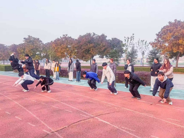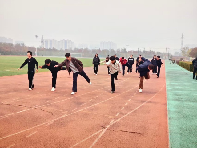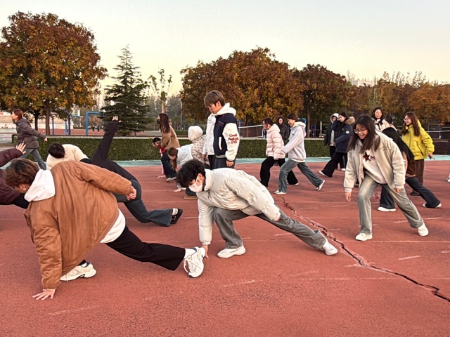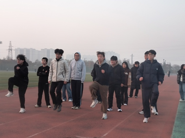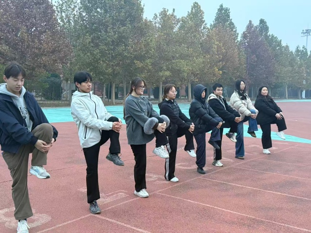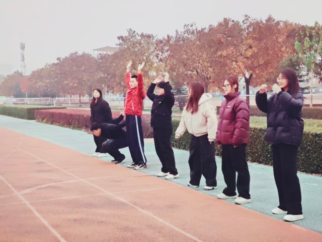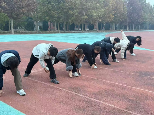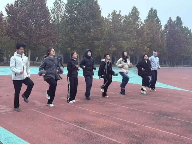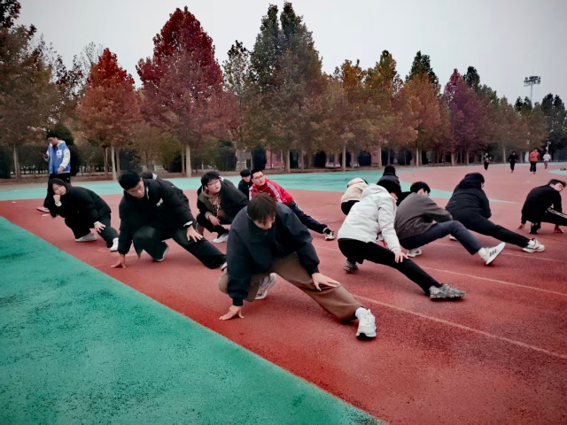 慢跑设定为 5 圈约 2 公里,距离适中——既不短到达不到热身效果,也不长到让体能较弱的同学却步,恰是与身体的温柔对话。哨声响起,同学们陆续迈步,起初队伍节奏参差:体能好的步伐轻快、呼吸平稳,运动少的则略显局促、步频稍缓。随着集体前行节奏渐趋统一,耳边的脚步声从杂乱变得整齐,宛如一首合拍的晨曲。