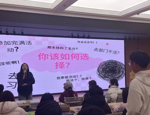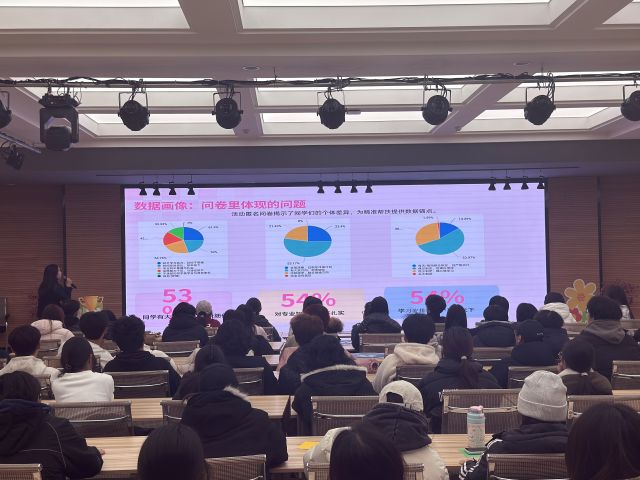 张潇尹老师以直观的数据统计来展开此次活动的讨论。数据表明,大多数同学在面对新的学习环境时,出现了“有大致方向,但未细化”“对专业知识掌握不扎实”“学业安排混乱,效率低下”等问题。在活动期间,同时还发现了在初入信院后,在部门、完满活动以及日常课程中遇到的的不合理时间分析。张潇尹老师对以上问题都一一进行了提问与解答。