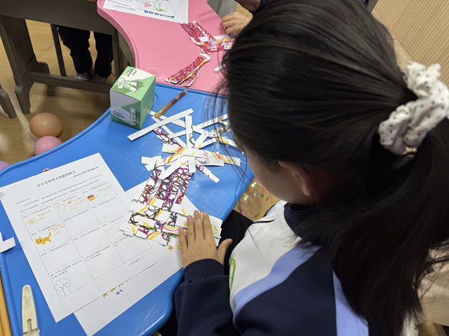 大家在老师和志愿者的示范下,用安全剪刀把画纸剪成细条,再把两种情绪的纸条交叉缠绕,做成“情绪图谱”。刘老师说:“如果情绪有颜色,乱糟糟的也能变好看。”
