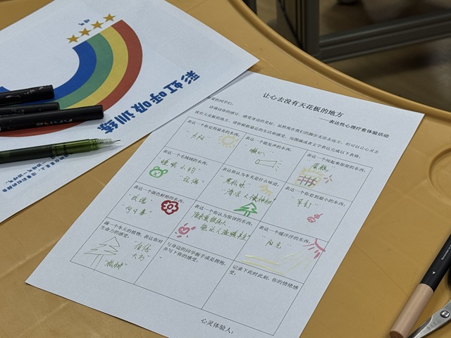 刘美君老师带着大家玩起了情绪表达:用两张卡纸分别画“心理的图案”和“混乱”——有人画软软的曲线,有人画缠在一起的线条,还有人涂了浓墨重彩的色块,每一笔都藏着自己的心思。