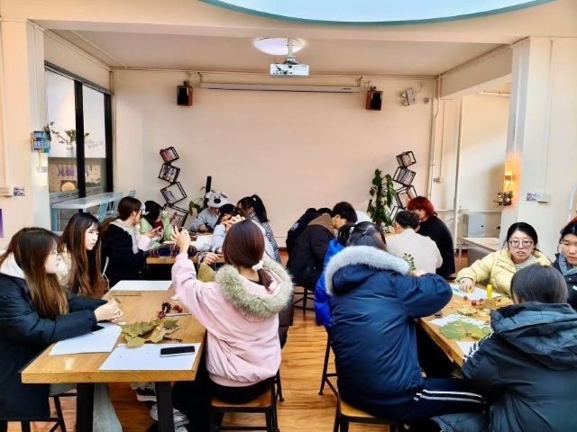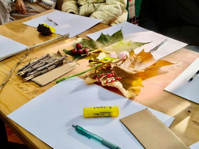 走遍校园收集了银杏叶、枫叶、梧桐叶等多种形态各异、色彩斑斓的落叶,还细心备齐了、丙烯马克笔、素描纸、彩色绳子、丝带等丰富工具与装饰材料,为同学们的创意落地保驾护航。活动现场布置得温馨雅致,散落的秋叶铺就自然底色,整齐摆放的材料包分类清晰,再搭配柔和的灯光,浓厚的创作氛围扑面而来,吸引了参与者的兴趣。