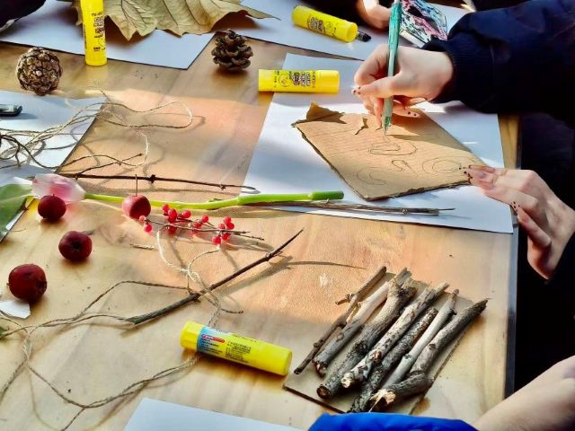 在“树枝门牌”制作中,热闹非凡。同学们以枯枝、落叶、松果为材,亲手打造专属宿舍门牌,让秋冬的自然元素成为校园生活的“温暖装饰”。以宿舍为单位分工协作,将干枯的枝干修剪成合适形状,搭配色彩斑斓的落叶与小巧的花朵,再用绳子缠绕固定,一个个充满个性的门牌不仅承载着深厚的宿舍情谊,更成为装点校园生活的独特风景。