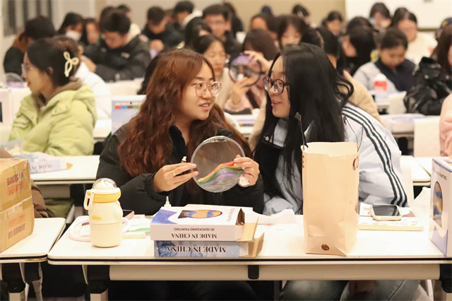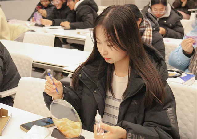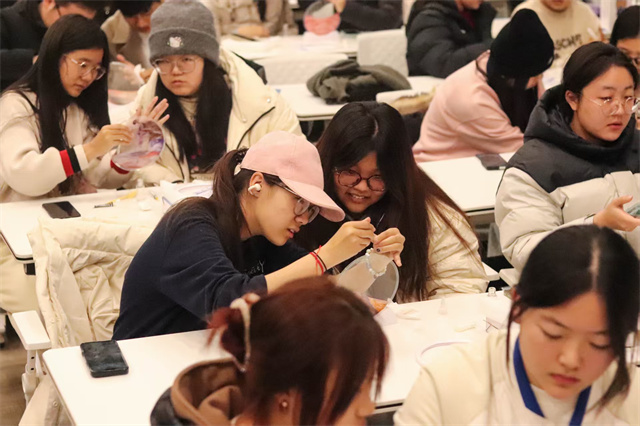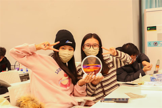 活动在温馨而专注的氛围中拉开帷幕。区别于传统沙画,“镜面流沙”以其独特的介质,为创作赋予了双重维度——流动的沙画与镜中的倒影虚实交织,构成一个如梦似幻的视觉空间。同学们在社团成员的指导下,让细腻的沙砾在指间流转,于镜面上勾勒出星辰、海洋与心中所想。每一幅作品都如其名,是“镜里揉碎的星光”,极致绚烂却又转瞬即逝,让所有参与者深刻体悟了刹那与永恒的辩证之美。