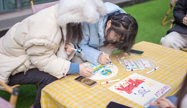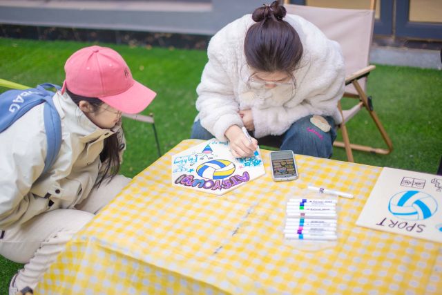 定格年轻锋芒,用“这局我C,涂鸦助威!”铸就活动灵魂底色!活动精准捕捉年轻群体对“个性化表达”的追求,打破传统赛场观赛的单向模式,让每一位参与者都成为排球应援的“亲手创作者”,在沉浸式体验中传递热爱与力量。活动现场精心划分三大功能区域,氛围感拉满:涂鸦区的长桌上,马克笔、空白木板、丙烯颜料整齐陈列,5人小组围桌而坐,或低头勾勒草图、或热烈讨论分工,创意在交流中不断迸发;展示区的展架上,提前张贴的排球主题海报色彩鲜明,将竞技热血与艺术氛围提前渲染;游戏区的排球筐旁,趣味互动环节已准备就绪,等待着创作后的欢乐延续。