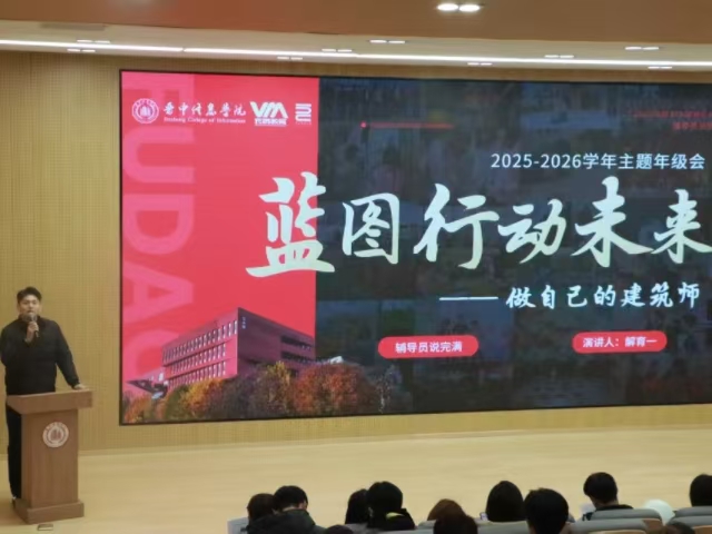 为引导同学们跳出被动成长,主动成为人生的“设计者”与“建造者”,将模糊的未来构想转化为清晰的成长蓝图,2025年11月27日18:00~19:00,艺术传媒学院辅导员解育一在ST报告厅举办“蓝图·行动·未来—做自己人生的建筑师”辅导员说完满活动。活动聚焦学生人生规划的核心需求,设置考研考公、简历指导、互动答题,班级大事件,表扬获奖同学,优秀班干部发言,同学们寄语,匿名民意调研等多个特色环节,帮助同学们明确前行方向,掌控成长节奏。