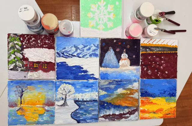原本平整的画布,渐渐“长”出了立体的温度:故宫的墙是深红的暖,木屋的窗户是橘红细砂的暖,杉树倒映的影子,是颜料轻扫出的软绵纹路。细节的点睛,让小画有了故事性:第一幅雪屋的窗棂点上暖黄,像是透出灯光的烟火气;雪人旁的尖顶帐篷,暗合“冬日露营”的松弛想象。每一笔点涂都带着心跳的节奏——粗砂是青春的莽撞,细砂是少年的温柔,那些藏在落日、雪地里的细碎欢喜,都顺着肌理的起伏,成了画里的“可触摸的风景”。待颜料半干时,画布上的风景已经活了:指尖触到的雪花有冬的清冽,摸到的城墙带着风的糙,连窗棂的光斑都裹着火炉的暖。