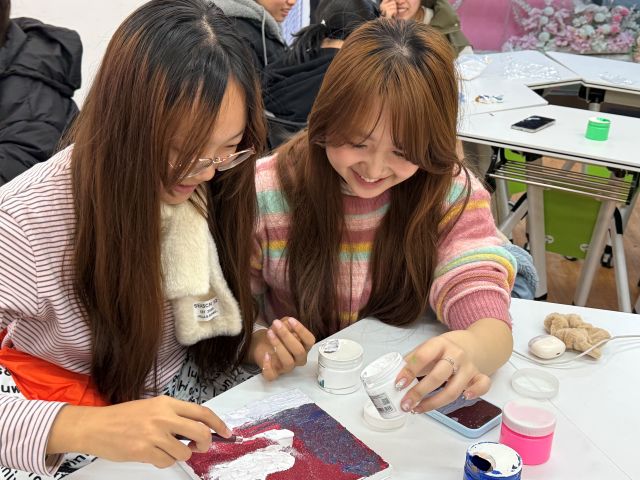 为了让灵感随肌理一同“生长”,活动现场还为同学们展示了几张色彩氤氲、质感绵密的肌理画,每一幅都是“触得到的治愈风景”。创作实践的氛围里,暖光裹着颜料的细砂香漫开——同学们望着范例里的校园肌理,眼底的光先一步落在画布上。有人蘸起浅黄粗砂,要复刻那一束落日;有人调了深蓝细砂,将大海的波纹揉进纹路;还有人拈着朱红颜料混着银砂,要把北京城墙的神秘感展现出来。落日、雪山、城墙……这些藏在日常里的碎片,都成了指尖的肌理素材。