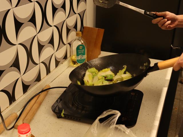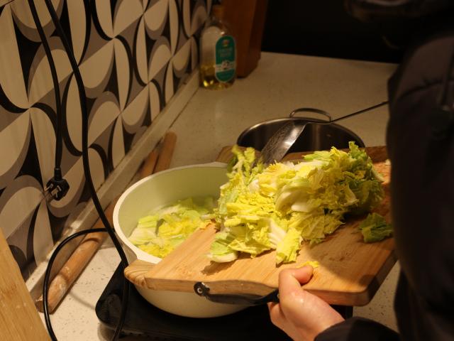 清洗白菜的清脆水声、切配辅料的细致专注、调配料汁时的认真斟酌……右岸厨房里,每一步都流淌着合作的暖意与探索的乐趣。选择“微辣”或“特辣”的小组,更围绕着辣椒的品种与投放比例展开了热烈讨论。大家戴上手套,将充分揉搓入味的白菜层层码入盘中,动作由生疏渐至熟练。当最后一勺料汁注入,参与者们仿佛亲手为一段风味之旅按下了启动键,眼中满是对未来“酸香”成果的憧憬。