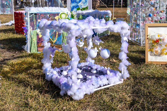 还有一些作品,专给日常废物“改简历”。塑料瓶、旧布料、废纸板……经过拆解、重组,再加上一点光影魔法,居然变身成会呼吸的“风光雕塑”。风吹过会唱歌,灯照过会画画,不起眼的材料在这里全都“华丽上岗”。