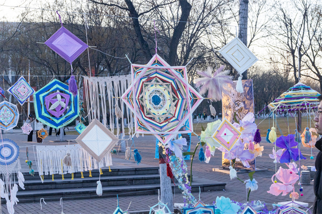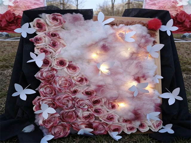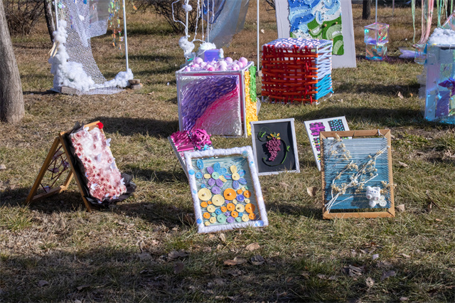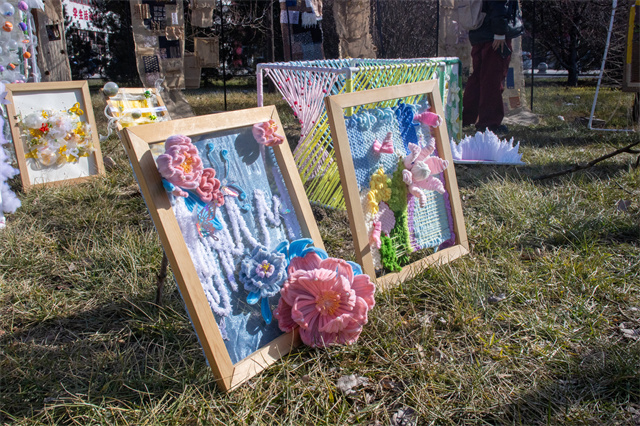 一进展场,眼睛就开始忙不过来——这边,几件作品正悄悄把自然“拆解”成视觉谜语:仿佛进入一个开放的美学实验室。各类作品以多元形式呈现,不追求单向展示,而强调可感、可触、可对话。纸张折出花瓣的弧度,毛球堆叠出蒜头的圆润,网格和布料层叠交错,仿佛植物在空气中生长的切片。色彩也在玩游戏:明亮的橙黄撞上安静的蓝白,像把阳光和月光同时铺开在你眼前。在这里,美不是遥不可及的术语,而是可参与、可共鸣的互动体验。走近看,材料都有小心机,远看却和谐得像一首轻快的立体诗。