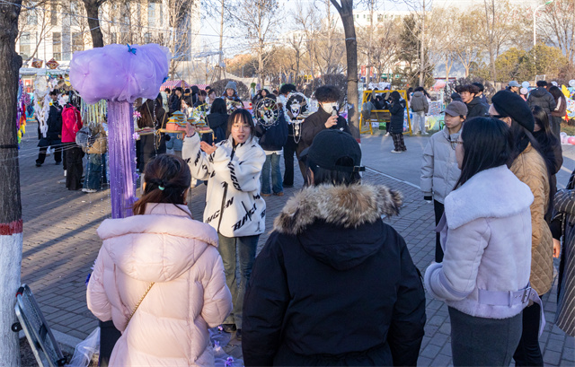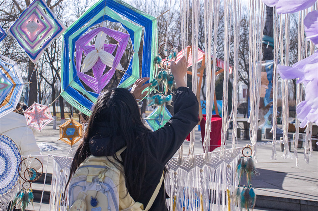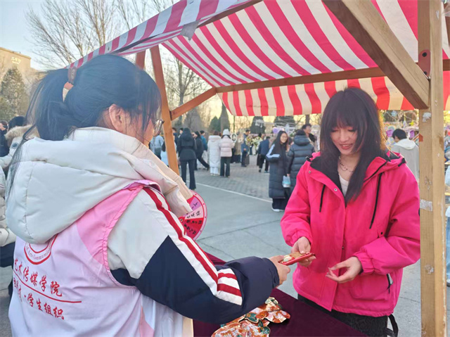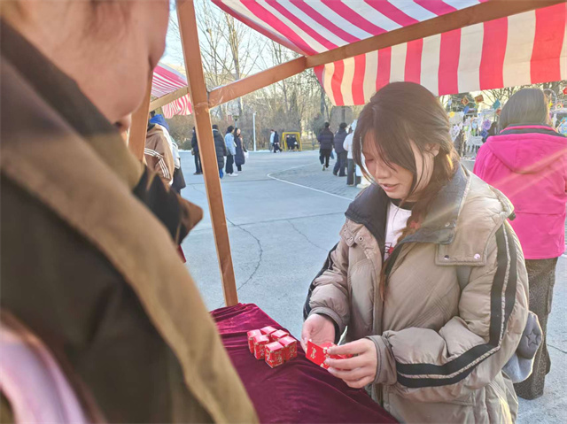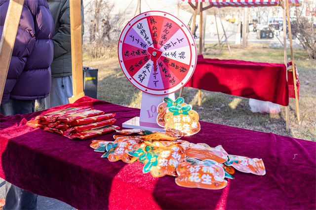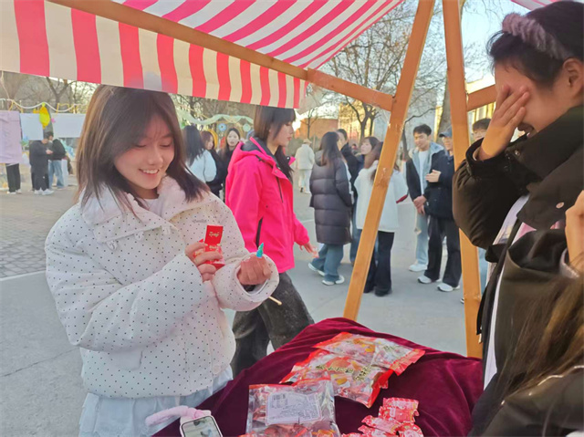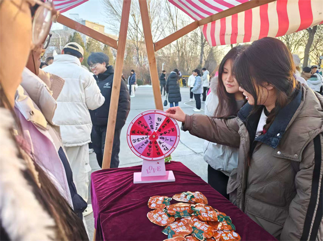 “快来试试手气——停在哪里,缘分说了算!”互动区的幸运转盘旁,同学们热情招揽。转盘唰地转动,彩色区块划成流动的光环,周围瞬间聚起一圈期待的脸庞。幸运互动转盘前总是充满欢声笑语,简单的游戏机制中融入了比例、节奏与视觉平衡的巧思。在这里,美育不是生硬的理论灌输,而是融入互动、寓教于乐的沉浸式学习。
