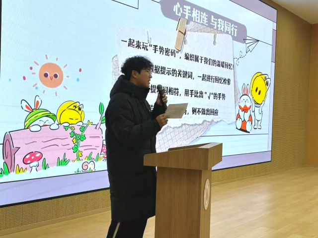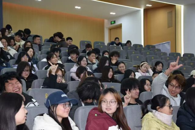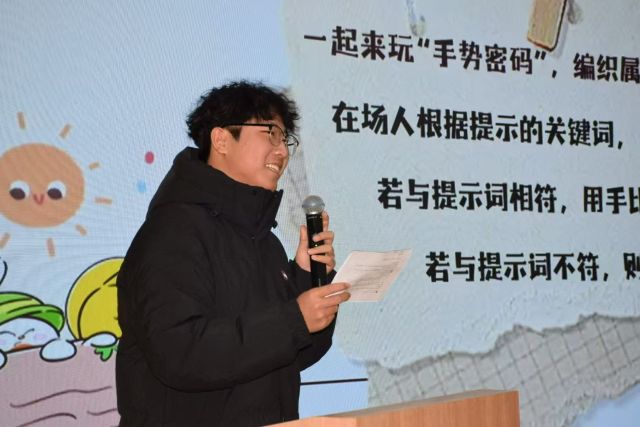 趣味互动环节成为活动的欢乐引擎,两场精心设计的游戏让现场氛围持续升温。在“成长故事传声筒”游戏中,同学们以“入学以来,我获得了什么”为开头,每人依次续写1-2句话并随机传递给下一位,最后由收尾的同学整合完整故事。“我获得了站上舞台的勇气”“我收获了一群并肩前行的伙伴”“我学会了如何协调团队工作”……一句句真挚的话语在传递中交织,拼凑出属于学生们的集体成长记忆,欢声笑语里满是班级成员间的默契与温情。而在“手势密码”游戏中,主持人随机说出“完满活动”“宿舍团建”“早八生活”等关键词,在场同学需快速反应,用比出“八”字手势的方式回应与关键词相关的经历。这场考验记忆与默契的游戏,不仅唤醒了大家对校园生活的点滴回忆,更让心与心的距离在互动中不断拉近,同学们的凝聚力得到进一步升华。