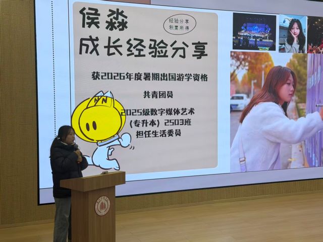 榜样的力量,是成长路上最鲜活的指引。活动特别设置优秀学子成长经验分享环节,李祥源、侯淼等两位在学业、完满实践、学生工作中表现突出的学子依次登台。李祥源分享了自己从刚进入校园的懵懂,到后来参加社团生活到上台表演,他提到在参加活动的过程中他也想过放弃,但是张潇尹老师对他给予了鼓励让他一直坚持了下去;侯淼同学是一名优秀的共青团员,也是一名班干部,她努力学习获得了出国游学的资格。他们用真实的经历、具体的案例,为同学们分享了如何平衡学习与生活。分享结束后,现场还展示了学子们在各类完满活动中的精彩瞬间展板,一张张定格的画面,既是对过往努力的肯定,也为更多同学点亮了成长的方向。