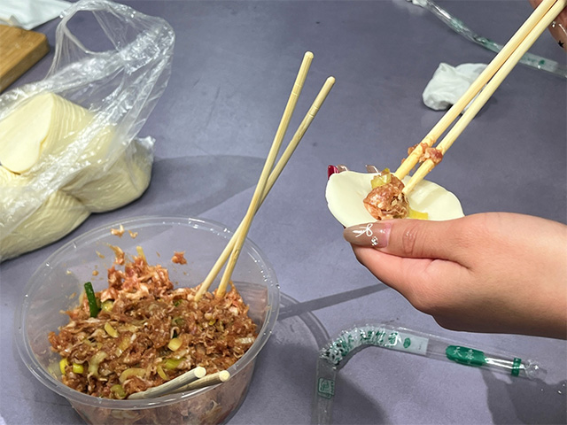 面团莹润,馅料藏情。活动伊始,揉好的面团、正宗东北猪肉大葱馅、擀面杖等工具整齐陈列,瞬间点燃了同学们的创作热情。任珊雨老师从面皮制作的细节切入,细致拆解“中间厚边缘薄”的关键技巧。同学们跟着实操才发现,这小小的饺子里藏着大学问:面皮的厚薄是老辈人的生活智慧,馅料的荤素搭配蕴含饮食文化的平衡,“冬至吃饺不冻耳” 的俗语更藏着民俗里的生存哲学——原来包的不只是饺子,更是一代代人接续的文化根脉。
