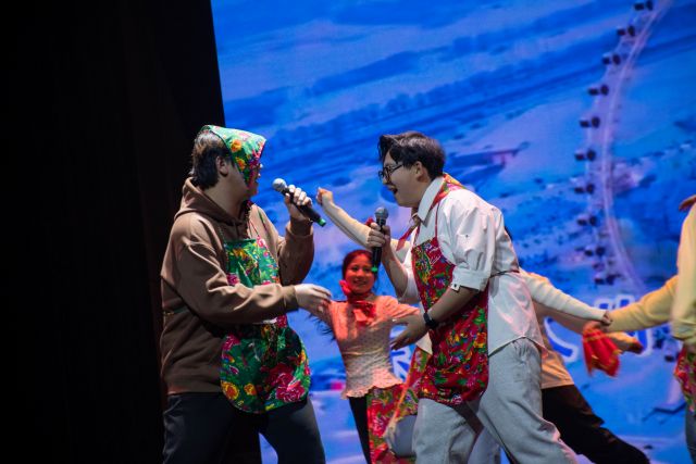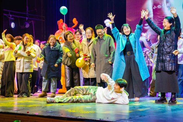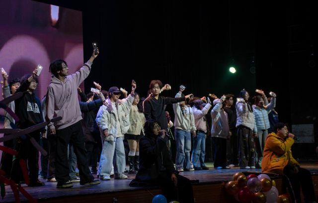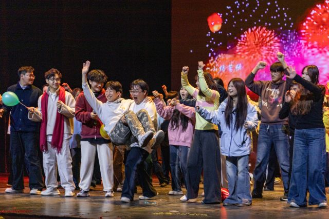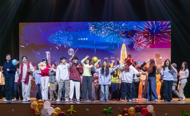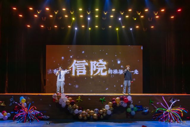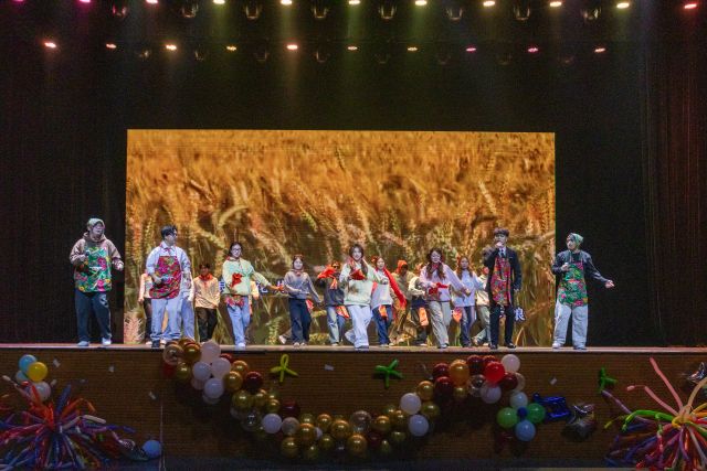 晚会尾声,小艺全体辅导员与学生会干部共同登台,合唱《相亲相爱》。熟悉旋律中,全场观众自发跟唱,温暖氛围洋溢整个剧场。