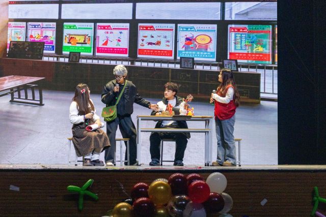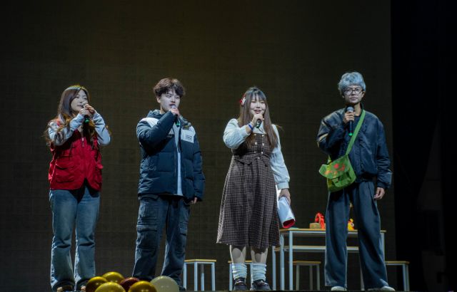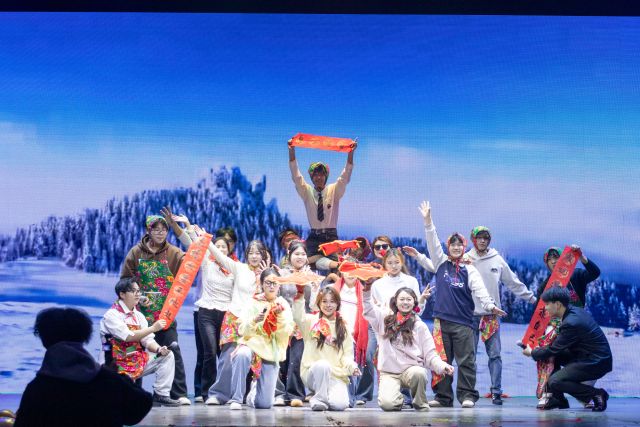 幸运沙漏开启,晚会进入首个互动板块。来自视觉、动画、电影专业的同学以一首《大东北》点燃全场,铿锵节奏与热烈气氛交织。随后,社团活动部呈现小品《不差“彩”》,幽默演绎中传递真挚情谊。