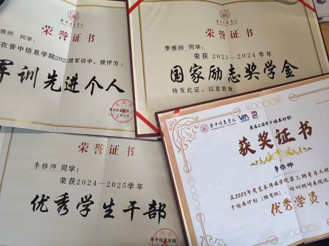 付出终有回响,成长自有印迹。从大一的广告艺术竞赛奖项,到荣获国家励志奖学金、优秀学生干部;从考取教师资格证、计算机证书,到攻读法学第二学历——这些认可从不是终点,而是催促我前行的动力。同时在“完满教育”的引领下,我逐渐读懂了青春:它不只关乎书本,更由责任、奉献与热爱浇筑而成。